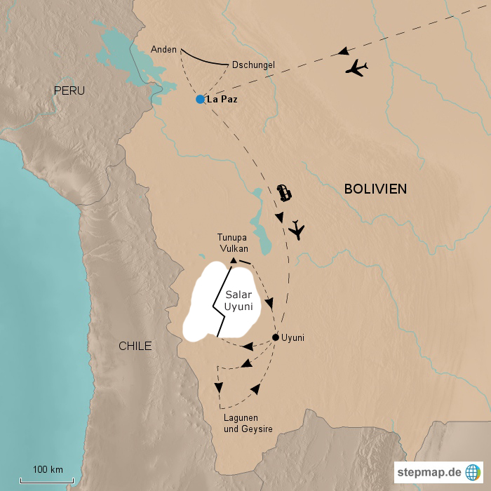 Mit der Bolivien-Wanderreise Salar de Uyuni Trekking – Wüste, Anden & Dschungel hat Jerome Blösser einen langgehegten Traum wahr gemacht: Puretreks ist weltweit der erste Reiseveranstalter, der den berühmten Salzsee Salar de Uyuni in einer mehrtägigen Trekkingtour komplett überquert. Die Teilnehmer erwartet ein exklusives Abenteuer in sensationeller Landschaft… Das Programm der Bolivien-Wanderreise ist abwechslungsreich und vor allem in Bezug auf eine gute Höhenanpassung gut strukturiert: So gibt es vor dem Trekking auf dem Salar de Uyuni eine 4-tägige Akklimatisationswanderung auf dem einsamen Choro Trail, die vom Dschungel hinauf in die Anden führt. Außerdem besteigen wir einen Vulkan und sehen weitere Highlights wie die farbenfrohen Geysire und Lagunen im Südwesten des Landes.