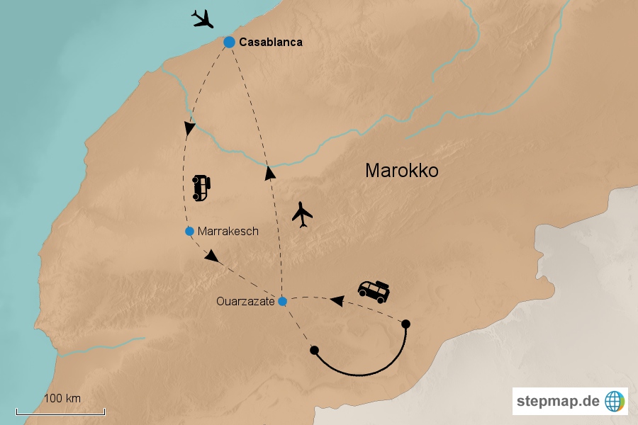 Am frühen Morgen erfolgt der kurze Transfer zum Flughafen von Ouarzazate und dann Rückflug via Casablanca nach Deutschland mit Ankunft am Nachmittag. (F,-,-)