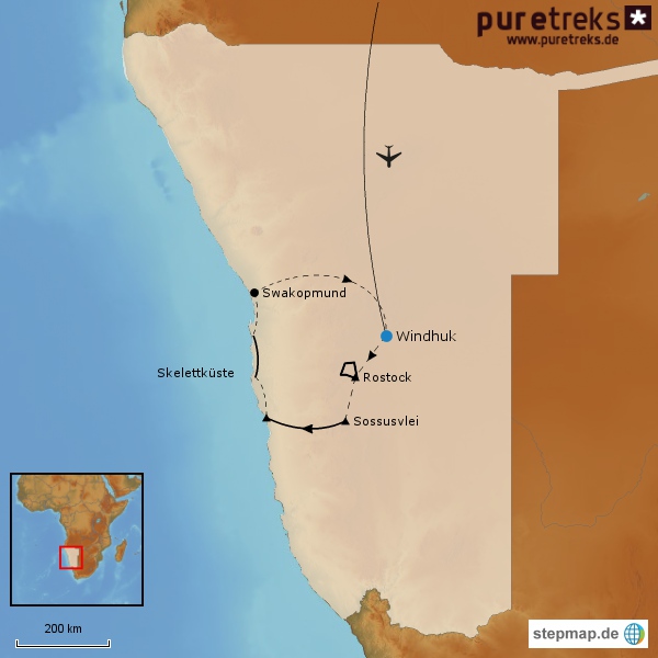 Stadtrundgang in Swakopmund und Besichtigung des sehenswerten Museums, eine Townshiptour, wo man eine Menge über das Leben der verschiedenen Volksstämme Namibias hautnah erfährt oder etwas Shopping und ein Besuch eines typischen Swakopmunder Caféhauses. Am Nachmittag ist eine Scenic Flight, also ein Rundflug über die Wüste, sicher ein „once in a lifetime“ Erlebnis. Dabei fliegt man über weite Strecke genau unsere Wanderroute nochmal ab. Am Abend dann gemeinsames Abschlussessen im angesagten Restaurant „the Tug“ an der Mole von Swakopmund. Nacht im Swakopmund Guesthouse (F,-,-)